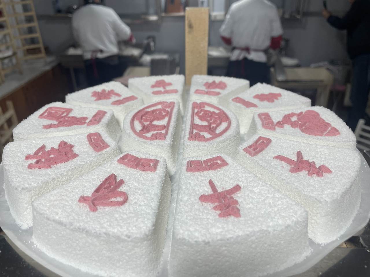 在王店镇三建村,糕点世家“荣归桥喜铺”的二代传人董雨强,正与两位糕点师傅在操作间内精心制作糕点。他们一身洁白工作服,佩戴着口罩和手套,手法娴熟地运用糕点模具。经过筛粉、填充豆沙、覆盖糯米粉、精细推平等多道工序,模具轻轻一压,“新年快乐、年年有余”等吉祥话语和图案便烙印在糕点上,一盒完美的圆糕雏形就是诞生。随后,董雨强将圆糕小心翼翼地移入预热好的蒸箱中,静待约20分钟后,再次开箱,热气即刻升腾,糕点的香气瞬间弥漫整间屋子。