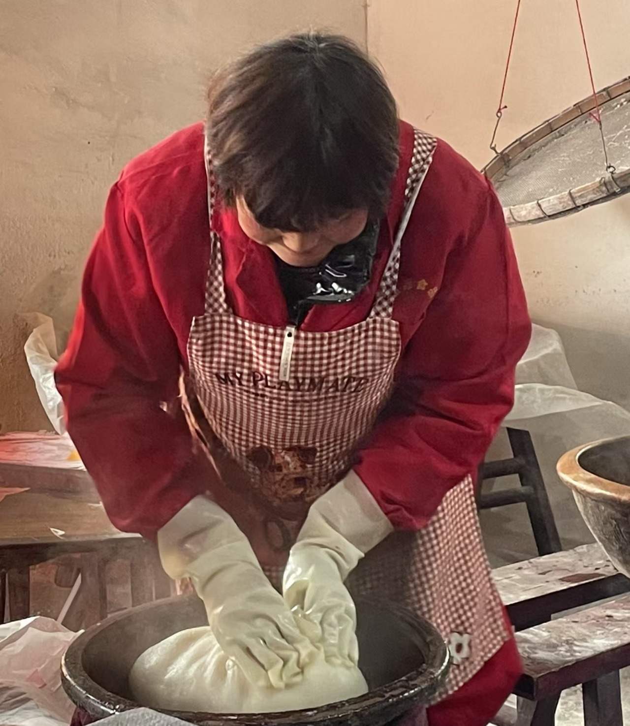 董雨强的手艺,师出他的丈母娘倪美英。在糕点铺里,糕点铺第一代传人倪美英正忙着制作洪合镇一位客户预定的上梁年糕。她将刚蒸熟的年糕放入石臼中,趁热徒手按压揉搓至表面光滑,然后铺在长桌上,以两人合力拉扯成长条。为了寓意吉祥,倪美英还在年糕上嵌入金元宝、戳上发财树的红印子,喜气洋洋的上梁年糕就此制作完成。
